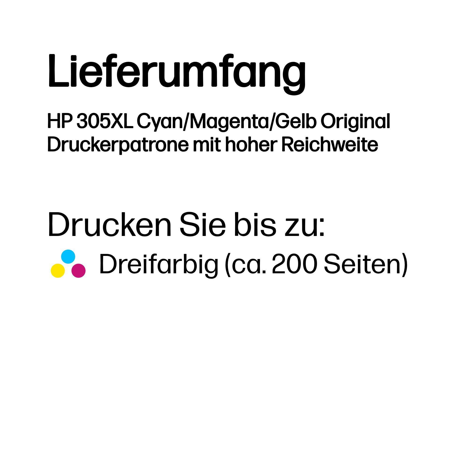 | Packungsinhalt | HP 305XL Cyan/Magenta/Gelb Original Druckerpatrone mit hoher Reichweite |