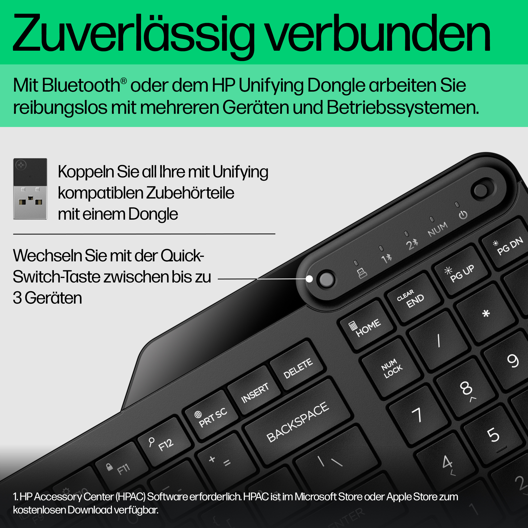 Mit der HP 475 Dual-Mode Wireless-Tastatur sind Sie jeder Aufgabe gewachsen. Sie bietet volle Bürofunktionalität und lässt sich gleichzeitig problemlos überall hin mitnehmen. Diese Tastatur für mehrere Geräte ist funktional und gleichzeitig mobil, vielseitig einsetzbar, verfügt über erhöhte Sicherheitsfunktionen und ist darauf ausgelegt, dass Sie mobil arbeiten und stets in Verbindung bleiben können.