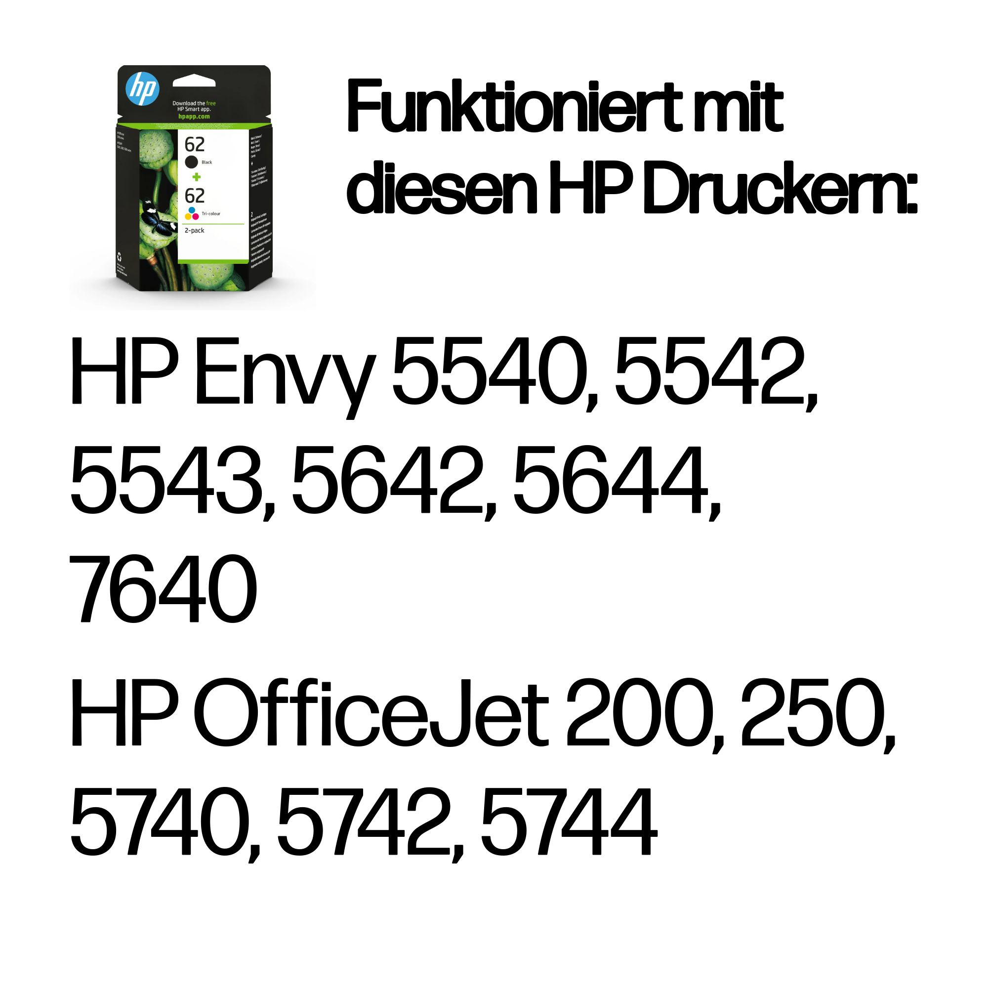 Kompatibilität | HP 62 Druckerpatronen funktionieren mit: HP Envy 5540, 5542, 5543, 5642, 5644 HP OfficeJet 200, 250, 5740, 5742, 5744 |