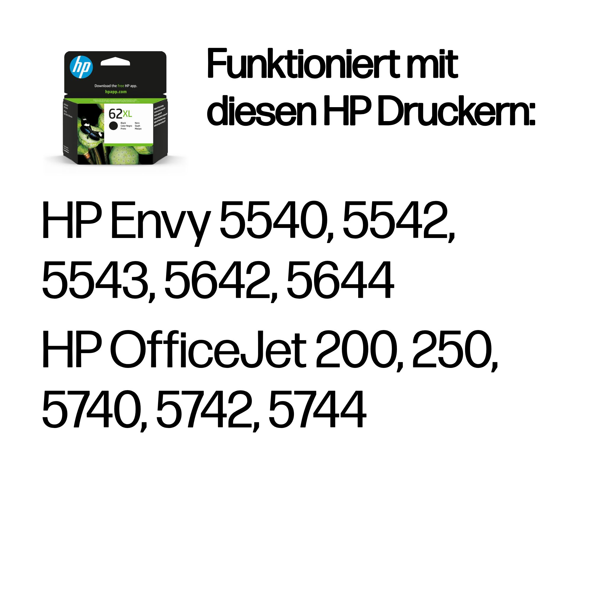 | Kompatibilität | HP 62 Druckerpatronen funktionieren mit: HP Envy 5540, 5542, 5543, 5642, 5644 HP OfficeJet 200, 250, 5740, 5742, 5744 |
