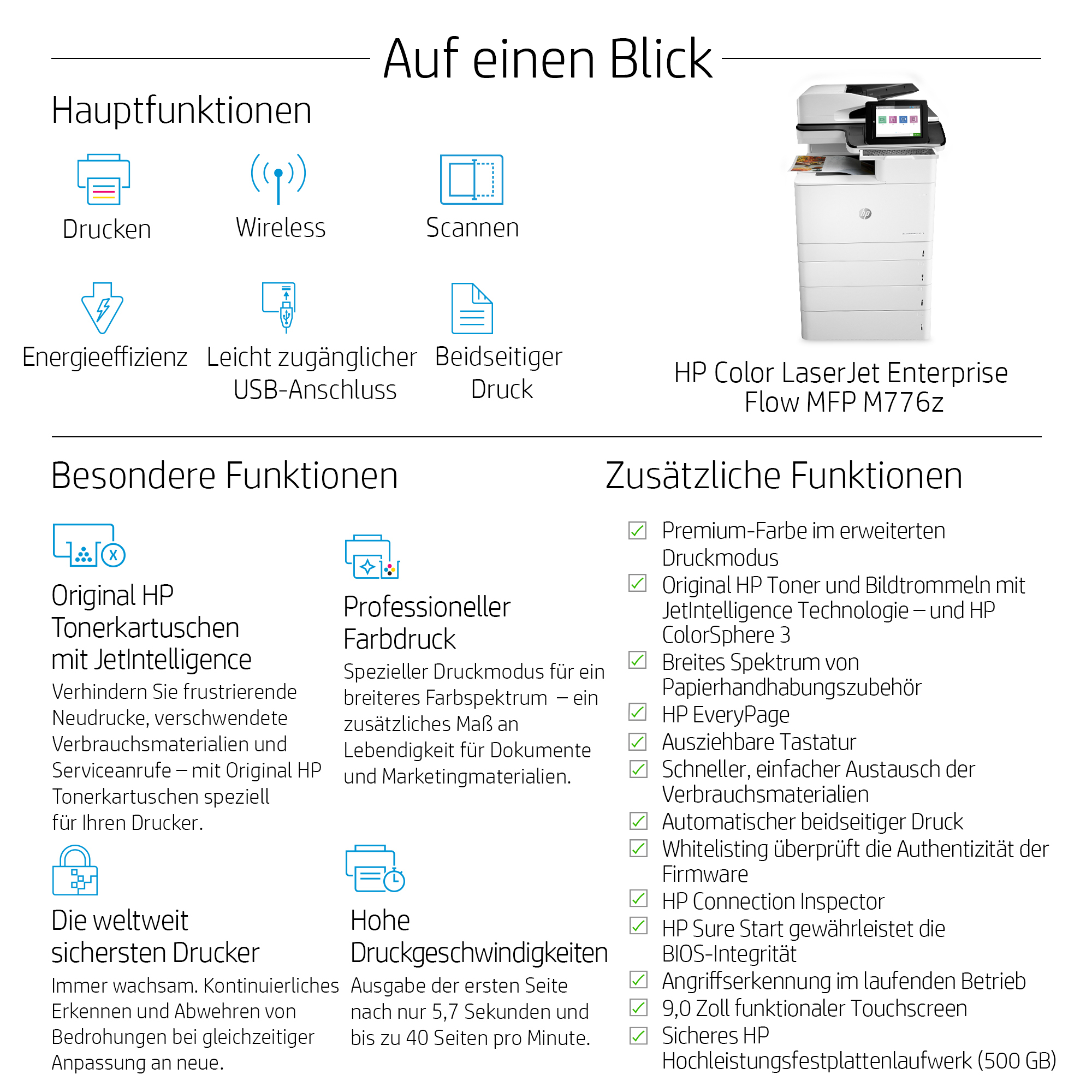 HP Color LaserJet Enterprise Flow LaserJet Enterprise Flow M776z Wireless Multifunction Farbe Drucker, Kopierer, Scanner; Duplex