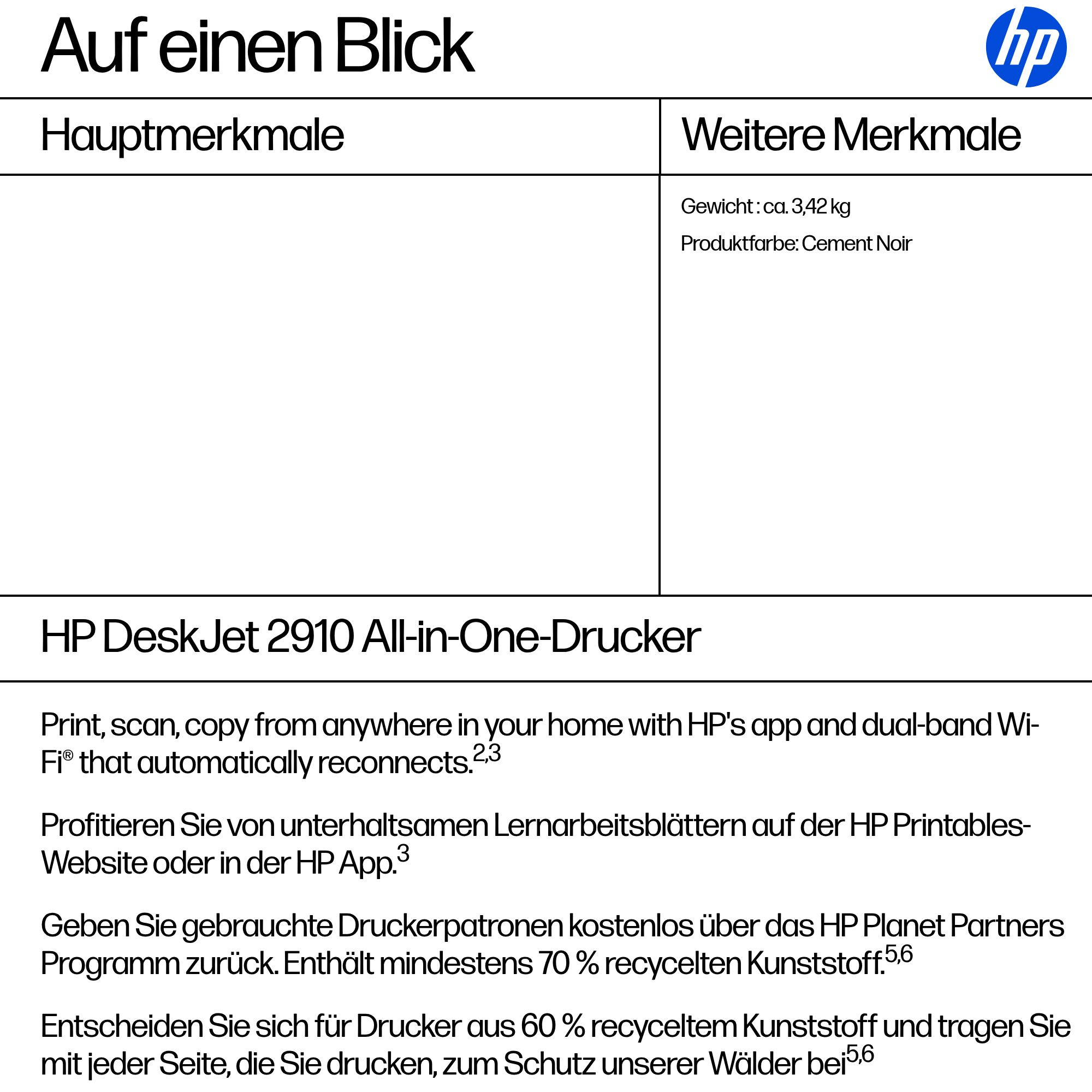 | Inhalt | HP DeskJet 2910 All-in-One Drucker; HP 308 Schwarz Setup-Druckerpatrone; HP 308 Setup-Druckerpatrone, Cyan/Magenta/Gelb; Merkblatt mit regulatorischen Bestimmungen; Installationsanleitung; Referenzhandbuch; Netzkabel [Informationen zu Tintenvolumen und Seitenreichweite unter http://hp.com/go/learnaboutsupplies] |