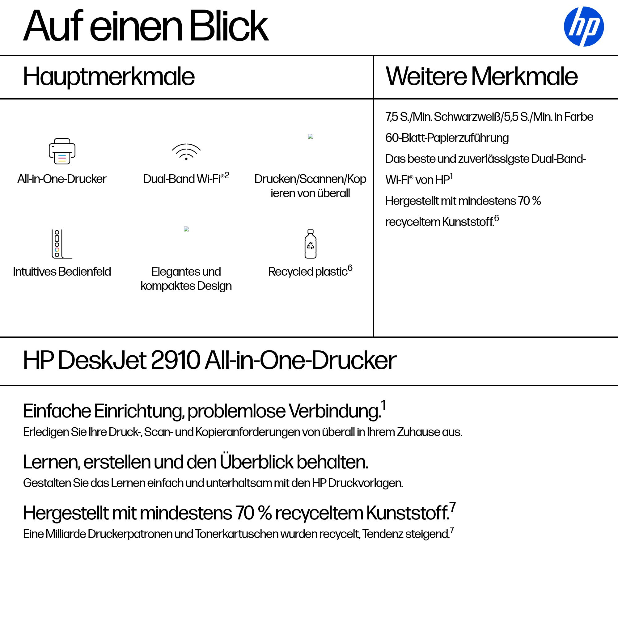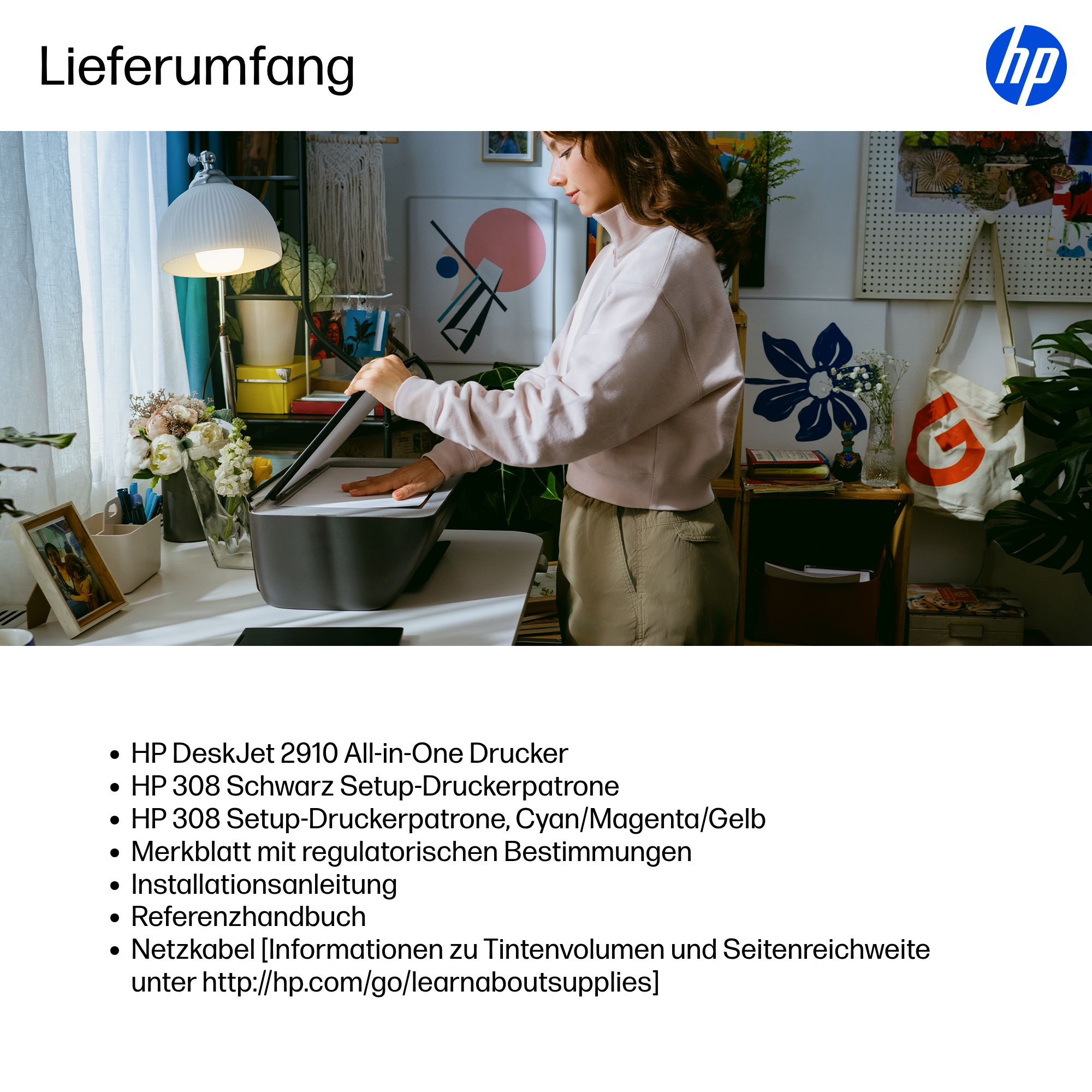 | Packungsinhalt | HP DeskJet 2910 All-in-One Drucker; HP 308 Schwarz Setup-Druckerpatrone; HP 308 Setup-Druckerpatrone, Cyan/Magenta/Gelb; Merkblatt mit regulatorischen Bestimmungen; Installationsanleitung; Referenzhandbuch; Netzkabel [Informationen zu Tintenvolumen und Seitenreichweite unter http://hp.com/go/learnaboutsupplies] |