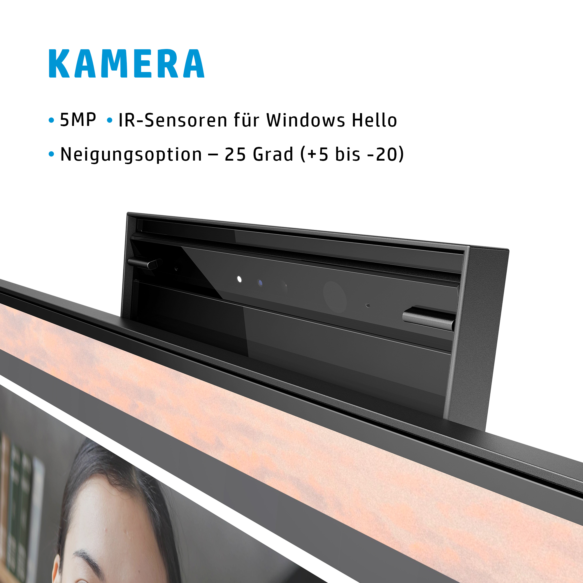 Verabschieden Sie sich von unscharfen Bildern oder einem dumpfen Ton bei Videogesprächen. Mit Lautsprechern und einem Mikrofon, die einen vollen, satten Klang erzeugen, und einer 5-MP-Webcam mit 25 Grad Neigungsverstellung für perfekte Winkel, Pop-up-Funktion für Privatsphäre und verbesserter Windows Hello-Unterstützung zeigen Sie sich bei jedem Anruf von Ihrer besten Seite.