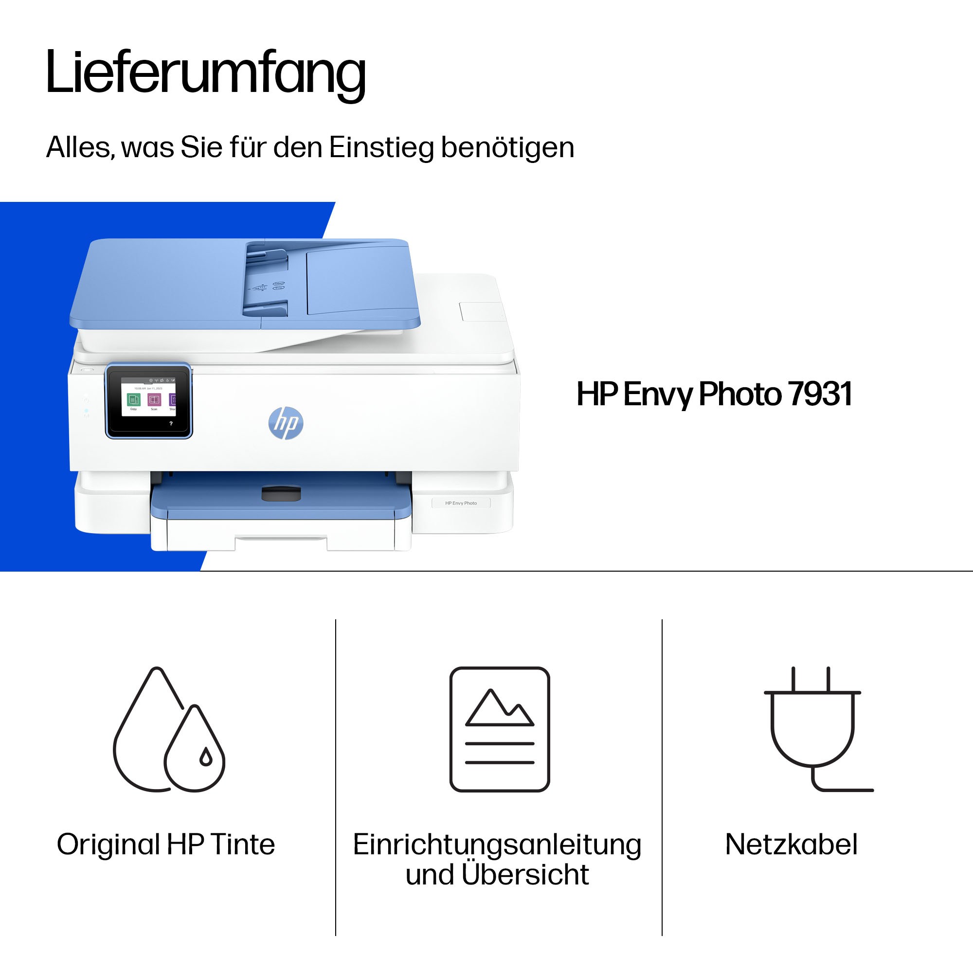 | Packungsinhalt | HP Envy Photo 7931 All-in-One-Drucker; HP 303 Schwarz Original Setup-Druckerpatrone; HP Cyan/Magenta/Gelb Original Setup-Druckerpatrone; Einrichtungsanleitung; Referenzhandbuch; Netzkabel |