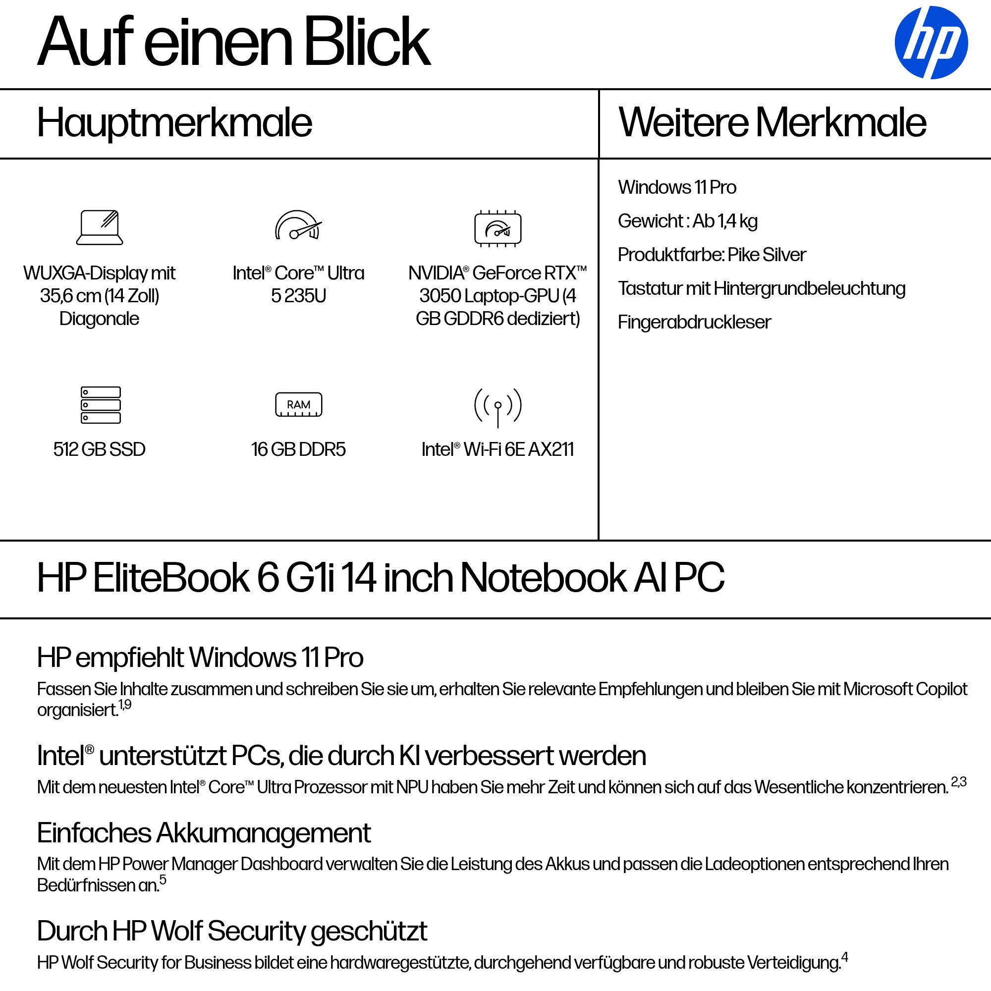HP EliteBook 6 G1i AI Intel Core Ultra 5 235U Laptop 35,6 cm (14") WUXGA 16 GB DDR5-SDRAM 512 GB SSD Wi-Fi 6E (802.11ax) Windows 11 Pro AI PC Silber