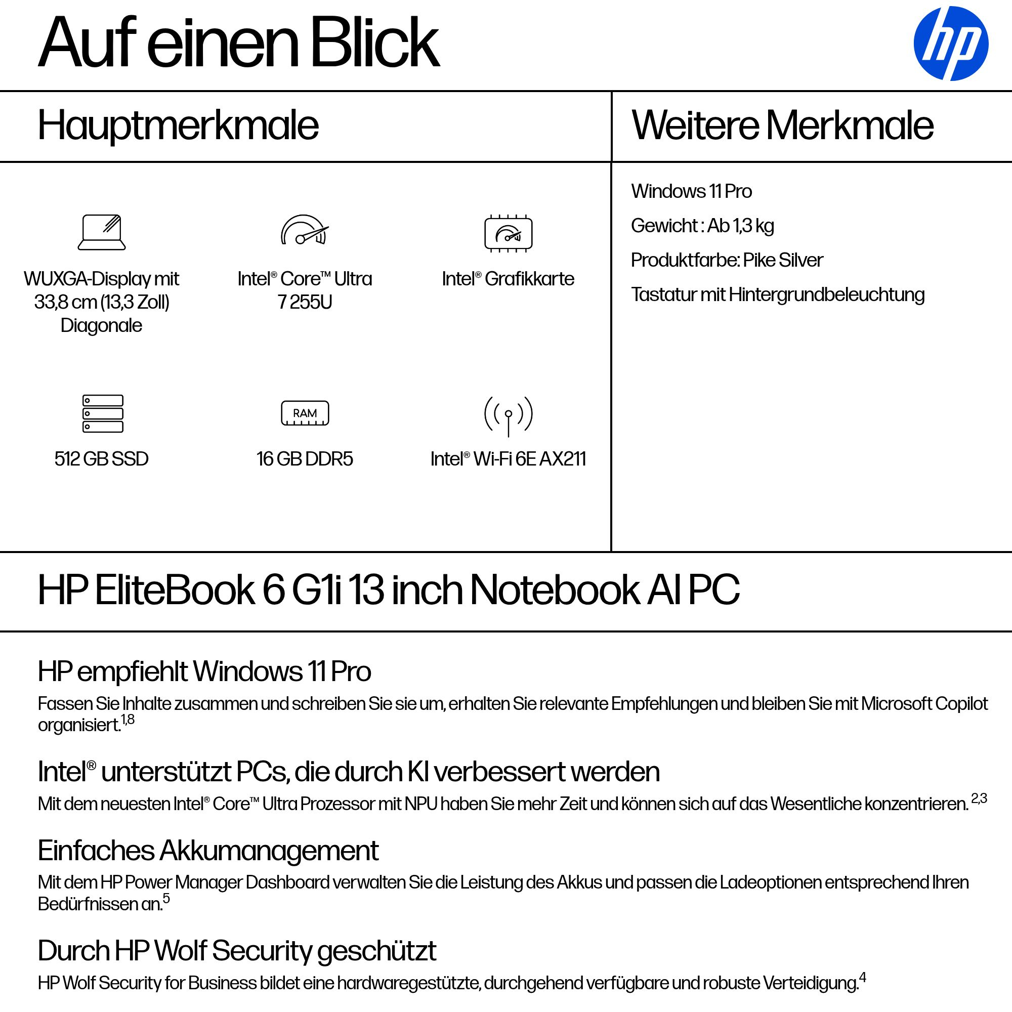 HP EliteBook 6 G1i AI PC Intel Core Ultra 7 255U Laptop 33,8 cm (13.3") WUXGA 16 GB DDR5-SDRAM 512 GB SSD Wi-Fi 6E (802.11ax) Windows 11 Pro Silber