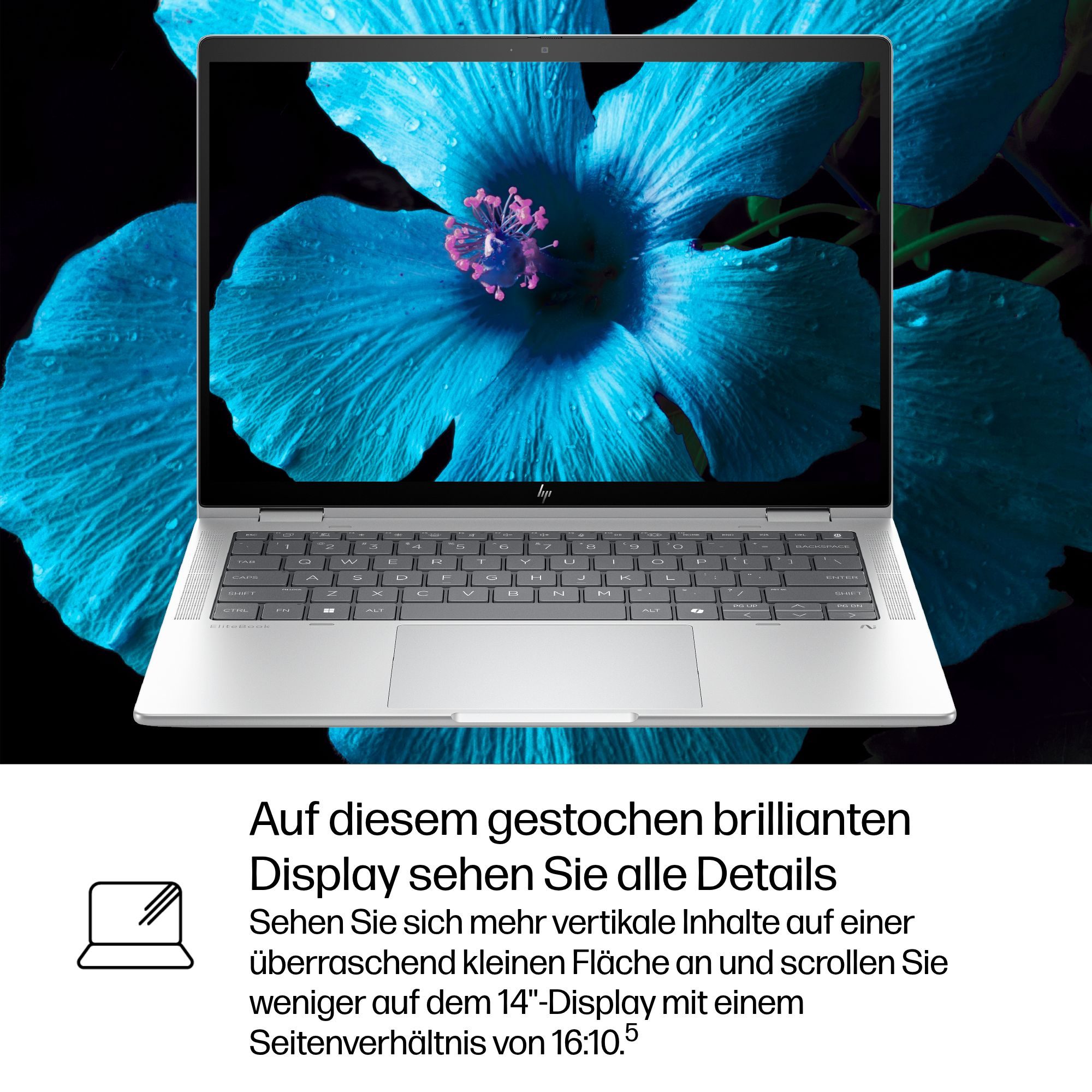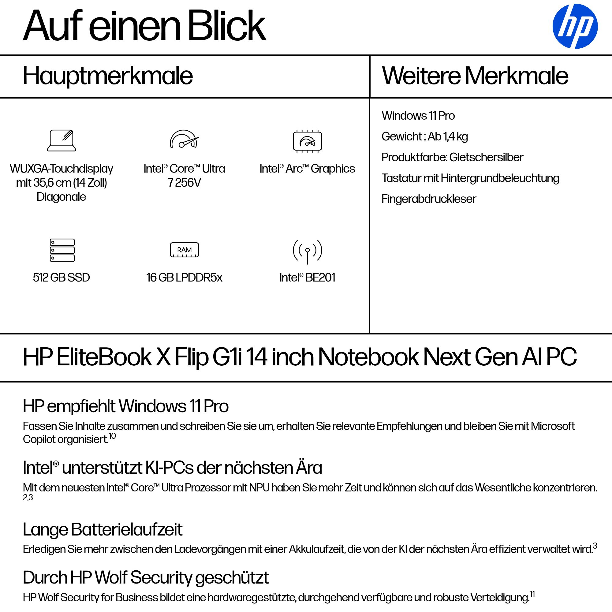 HP EliteBook X Flip G1i Next Gen AI PC Copilot+ PC Intel Core Ultra 7 256V Hybrid (2-in-1) 35,6 cm (14") Touchscreen WUXGA 16 GB LPDDR5x-SDRAM 512 GB SSD Wi-Fi 7 (802.11be) Windows 11 Pro Silber