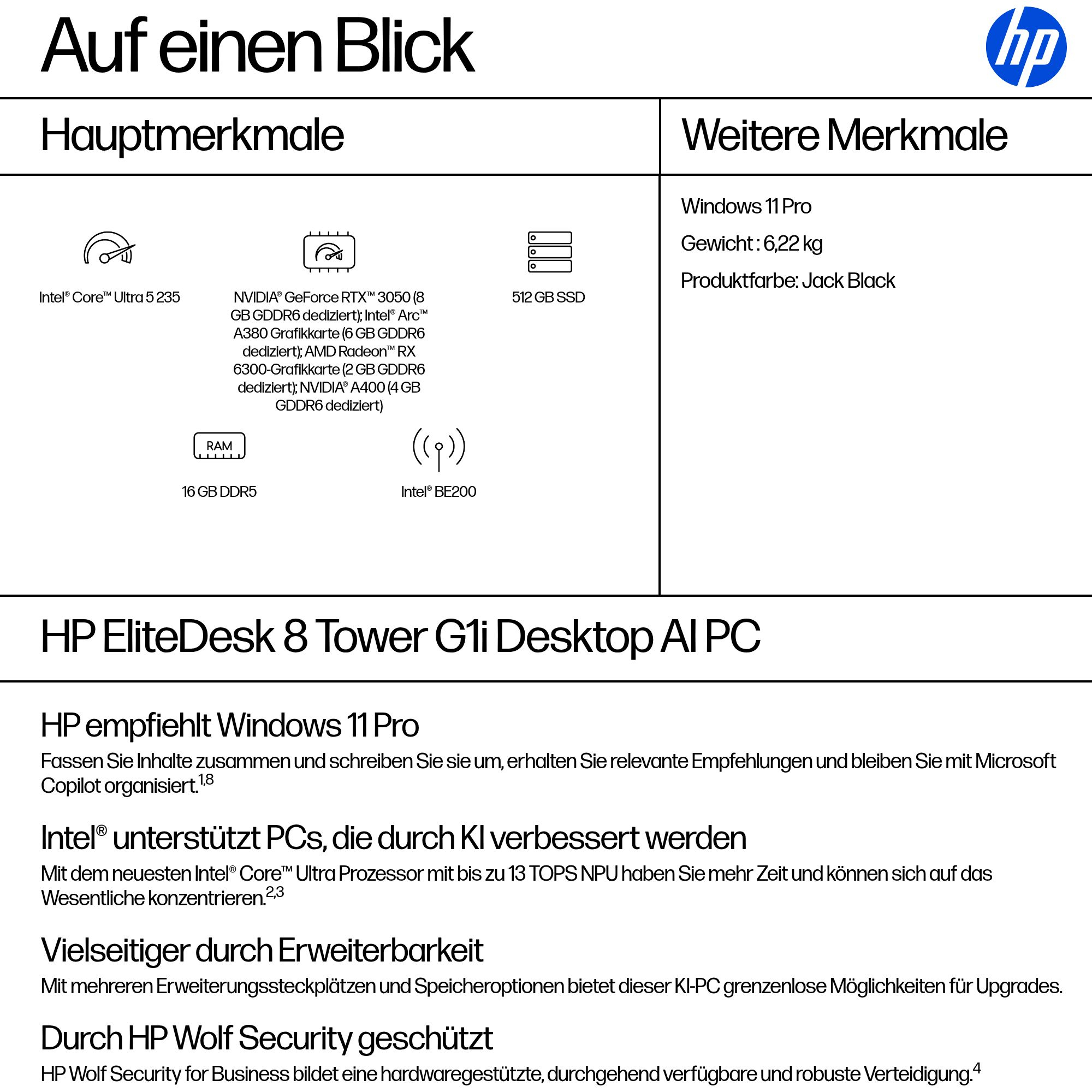 HP EliteDesk 8 Tower G1i Intel Core Ultra 5 235 16 GB DDR5-SDRAM Windows 11 Pro PC AI PC Schwarz