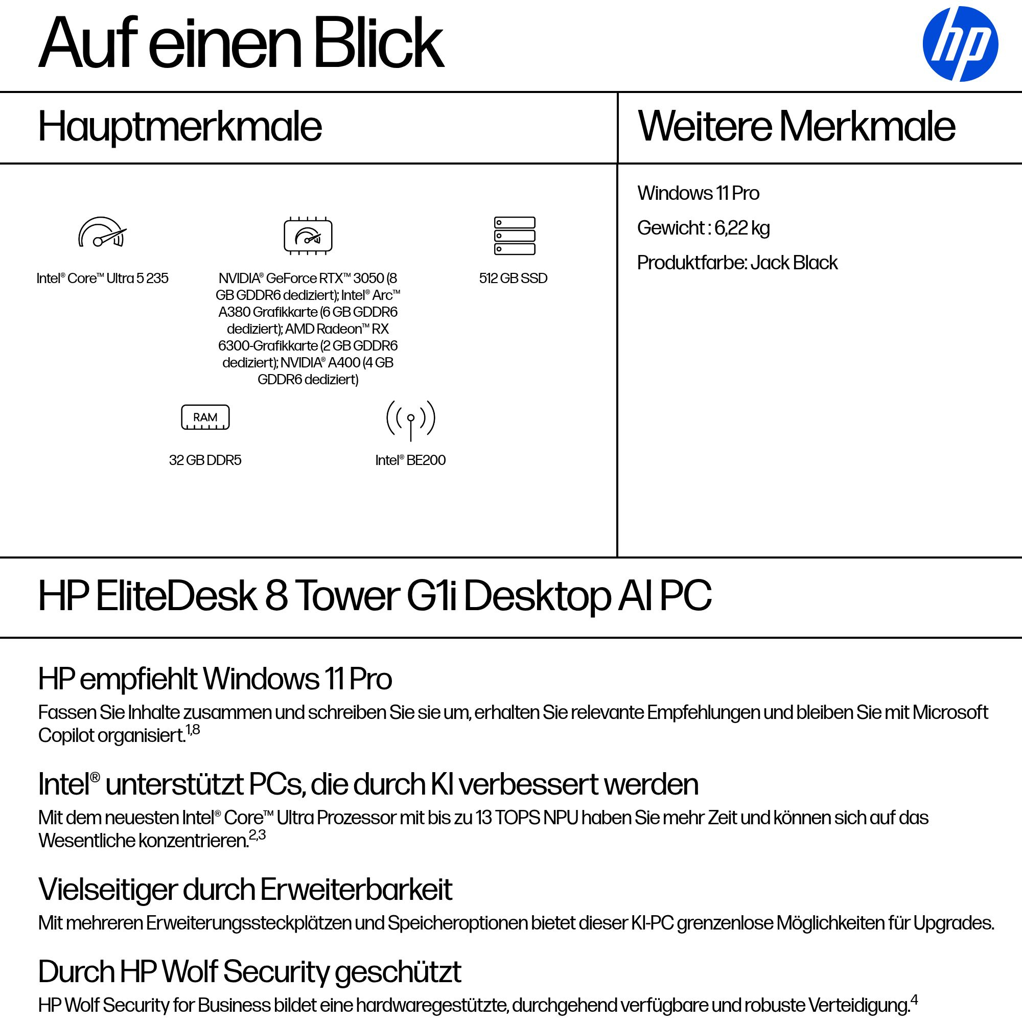 HP EliteDesk 8 Tower G1i Intel Core Ultra 5 235 32 GB DDR5-SDRAM Windows 11 Pro PC AI PC Schwarz