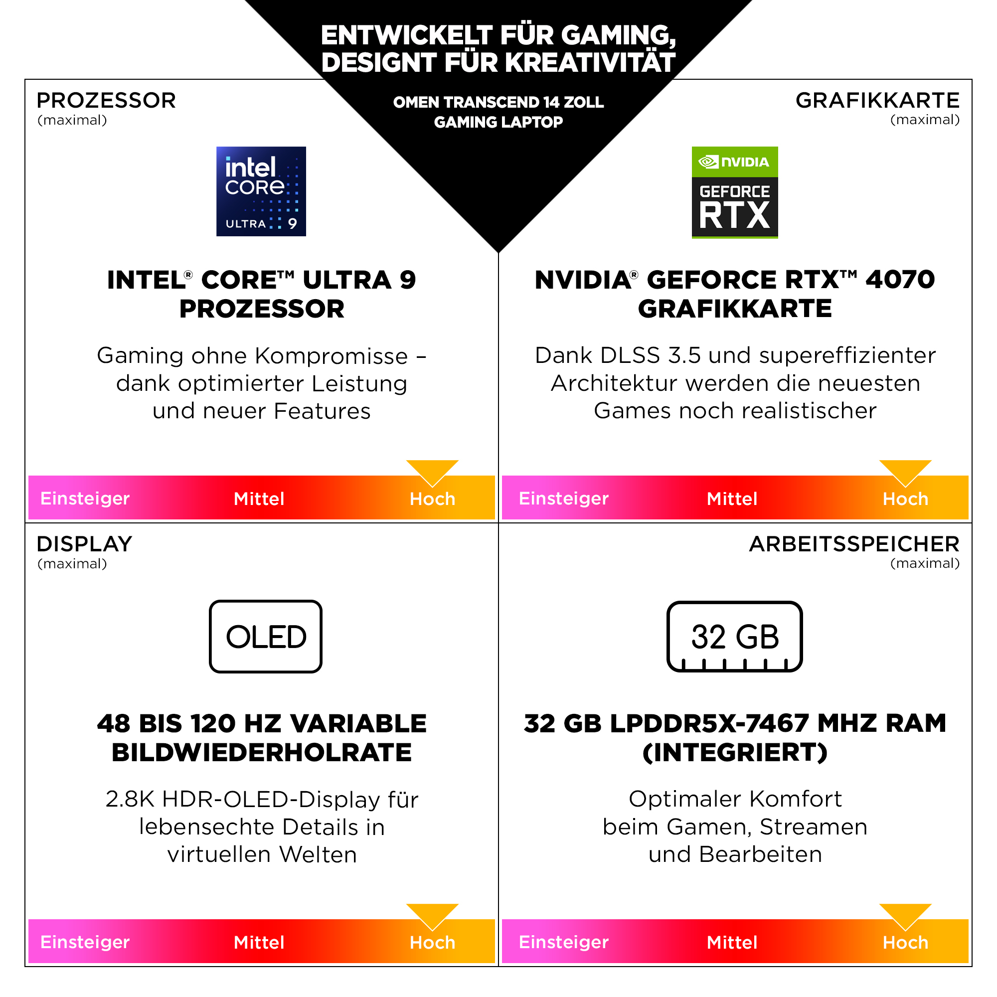Erlebe eine Mischung aus Premium-Design und Hochleistung mit einem ultraflachen und leichten Gerät, dessen Gehäuse vollständig aus Metall besteht. Profitiere von einer langen Akkulaufzeit, USB-C™ Schnellladefunktion und einem Prozessor bis max. Intel Core™ Ultra[2], NVIDIA Grafik der Serie GeForce RTX™ 40 sowie einem 2,8K OLED-Display mit 120 Hz[1]. Ideal für jeden Computing-Bedarf, einschließlich Gaming.