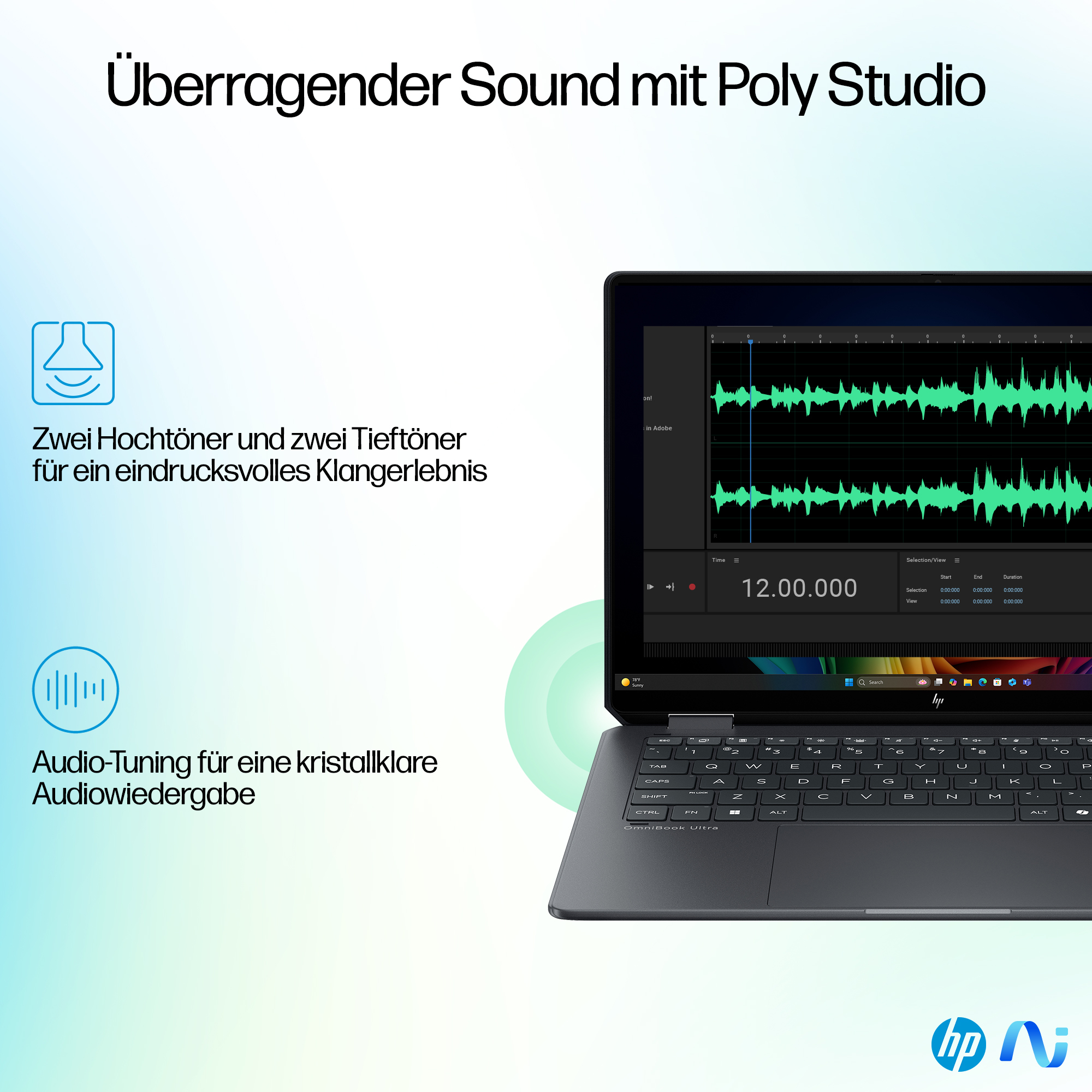 | Nachhaltige Technologien und Materialien | Kunststoff, der andernfalls ins Meer gelangen würde, in Lautsprechergehäuse und Rahmen; Recyceltes Metall in Abdeckung, Tastaturrahmen, Basis und Scharnierkappen; Tastatur-Keycaps und -Scissors bestehen aus recyceltem Kunststoff |