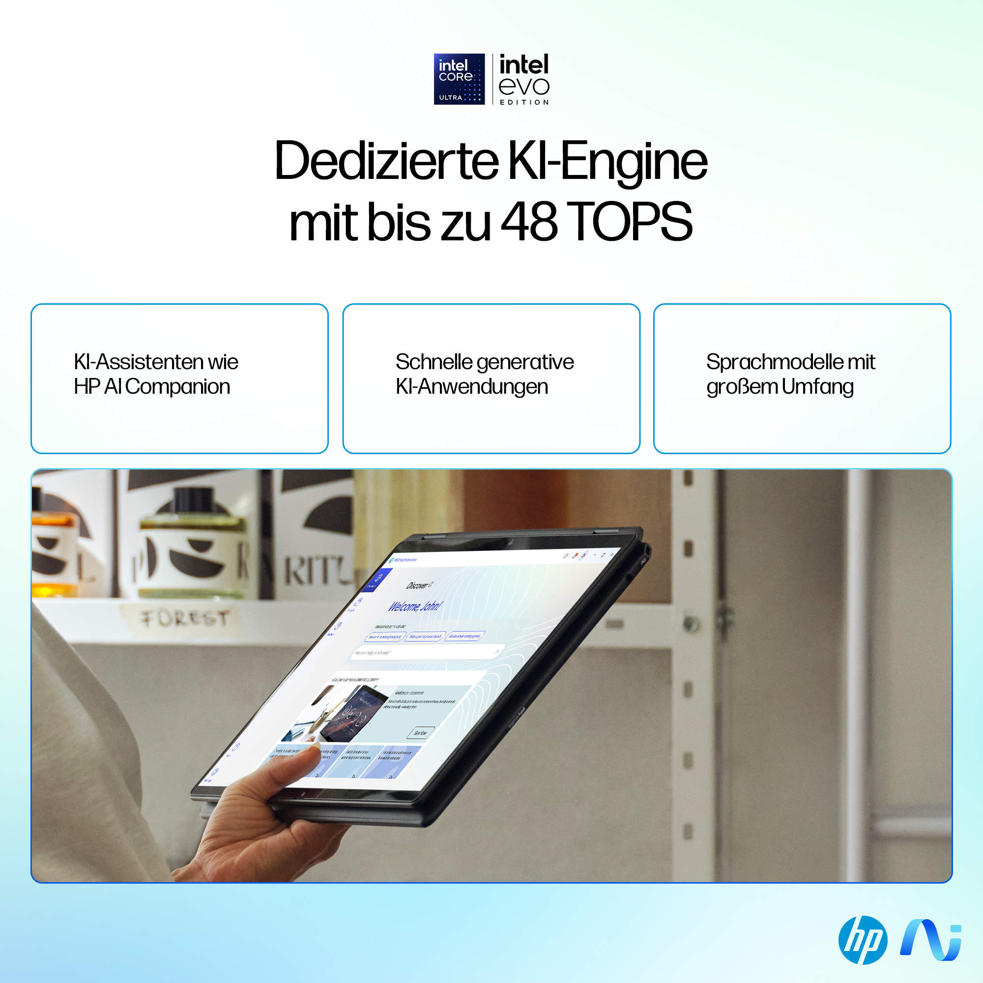 Bewältige auch anspruchsvolle Aufgaben mühelos dank Intel® Core™ Ultra Prozessoren. Verbessere das KI-Erlebnis in Hunderten von Anwendungen.<sup>[9]</sup>