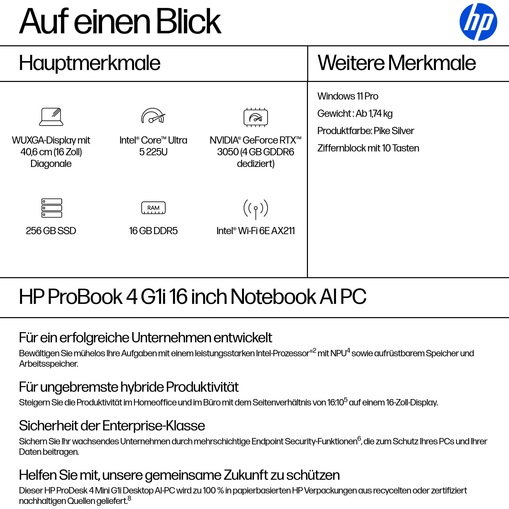 Der HP ProBook 4 G1i 16 Zoll Notebook-AI-PC bietet wachsenden Unternehmen kommerzielle Leistung, mehrschichtige Endpoint Security[6] und Haltbarkeit in einem leicht aufzurüstenden Design. Mit dem neuesten Intel-Prozessor[2] mit 11 TOPS-NPUs[4] und einer langen Akkulaufzeit ist dieser funktionsreiche PC zukunftsbereit für langfristige Produktivität und KI-Forschung.