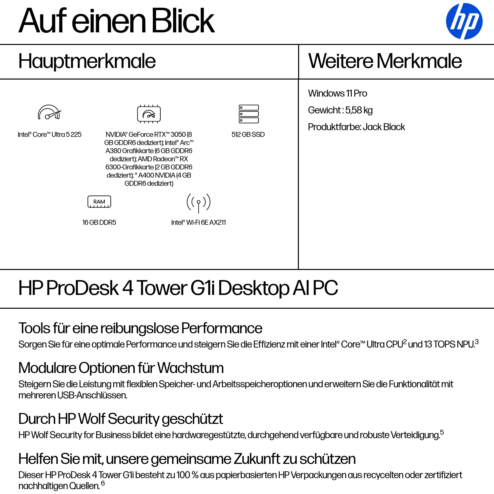HP ProDesk 4 G1i AI Intel Core Ultra 5 225 16 GB DDR5-SDRAM 512 GB SSD Windows 11 Pro Tower PC AI PC Schwarz
