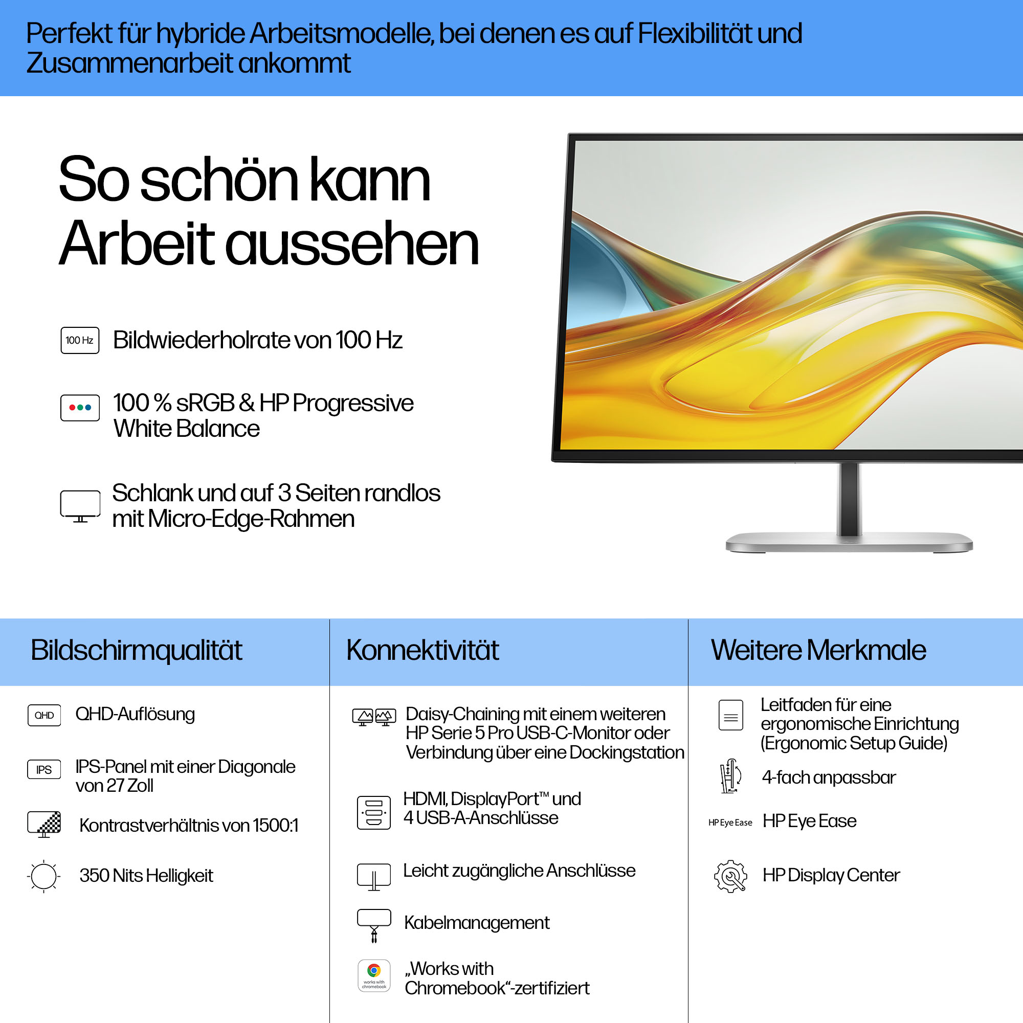 Machen Sie mit dem HP Serie 5 Pro 27 Zoll QHD-Monitor mehr aus Ihrem Arbeitstag. Schaffen Sie sich Ihr ideales Setup, wo auch immer Sie arbeiten, mit feiner optischer Klarheit und anpassbarem Komfort, integriert in ein kompaktes, modernes Design.