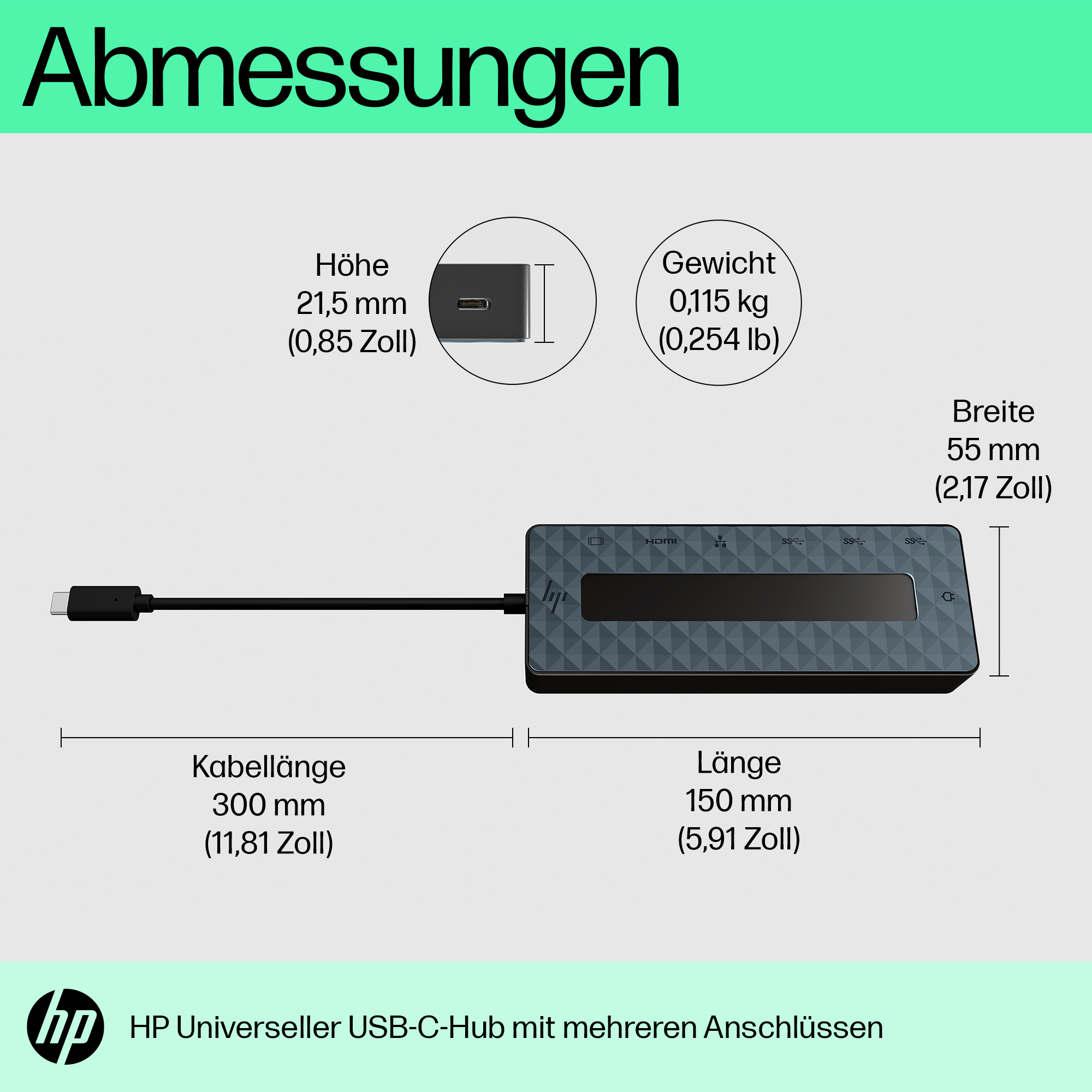 Schaffen Sie neue Möglichkeiten mit dem HP Universellen USB-C-Hub mit mehreren Anschlüssen – jetzt mit Unterstützung für alle PCs mit USB-C[1]. 7 Anschlüsse, 1 Strom- und Daten-Passthrough-Kabel und zahlreiche Peripheriegeräte für ein System nach Ihren Vorstellungen. Mit HDMI 2.0 und 1 DisplayPort™ 1.2 unterstützt der Hub zudem zwei 4K[2]-Displays. Dieser Hub bietet Ihnen alles, um immer bestens in Verbindung zu bleiben.