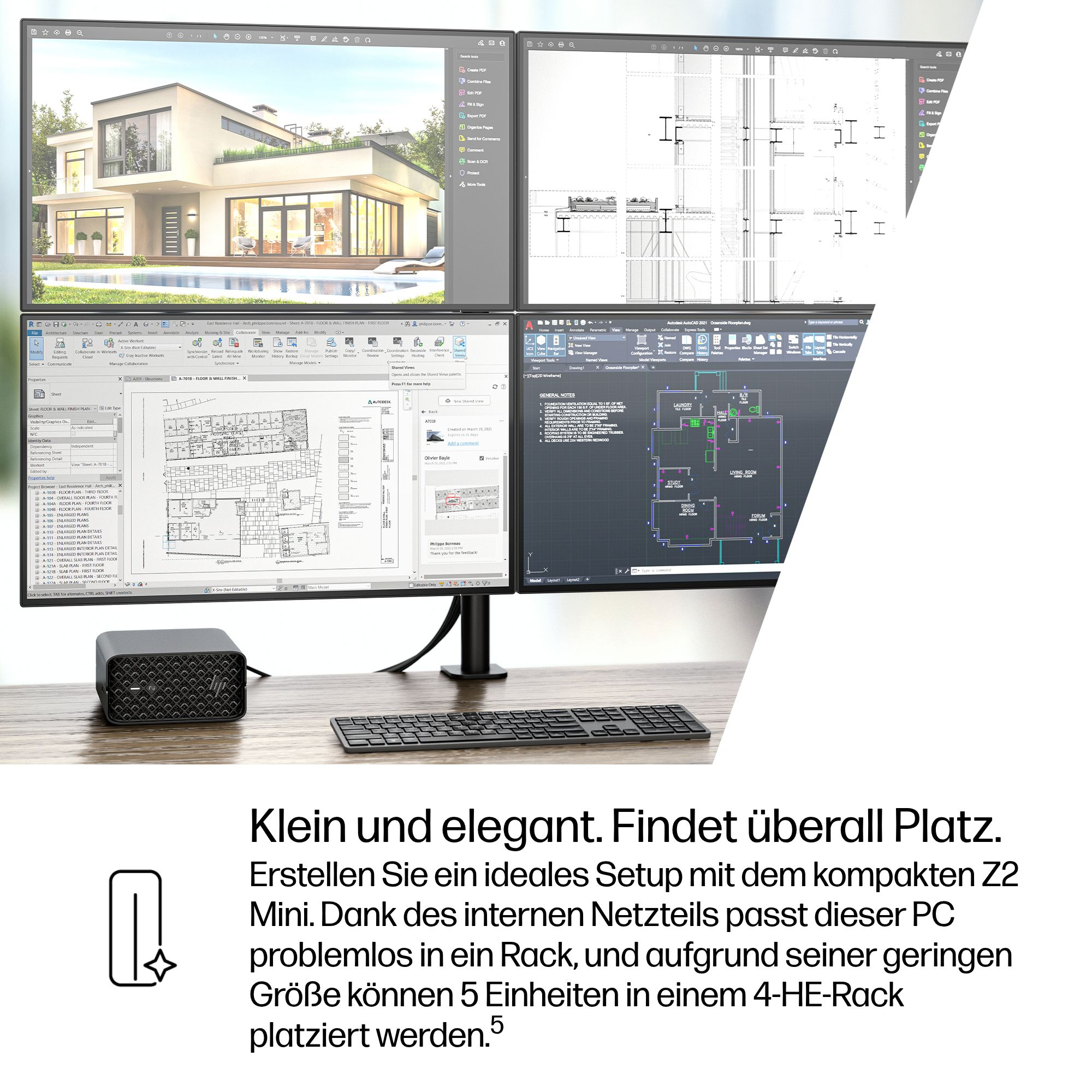 Erstellen Sie ein ideales Setup mit dem kompakten Z2 Mini. Stellen Sie das Gerät auf Ihren Schreibtisch, befestigen Sie es darunter oder bringen Sie es hinter Ihrem Monitor an. Dank des internen Netzteils passt dieser PC problemlos in ein Rack, und aufgrund seiner geringen Größe können 5 Einheiten in einem 4-HE-Rack platziert werden.[3]
