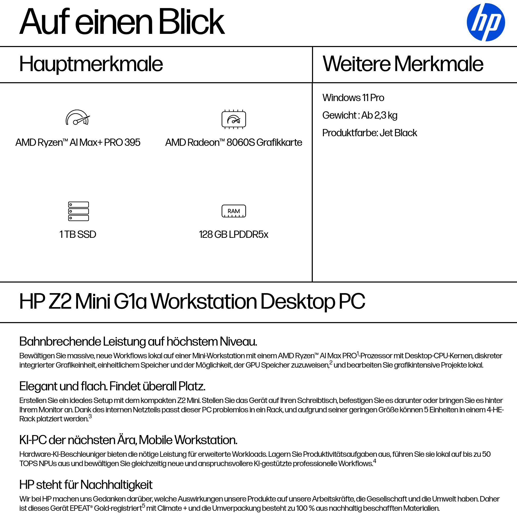 HP Z2 G1a Copilot+ PC AMD Ryzen AI Max+ PRO 395 128 GB LPDDR5x-SDRAM 1 TB SSD Windows 11 Pro Mini PC Arbeitsstation AI Workstation, AI PC Schwarz